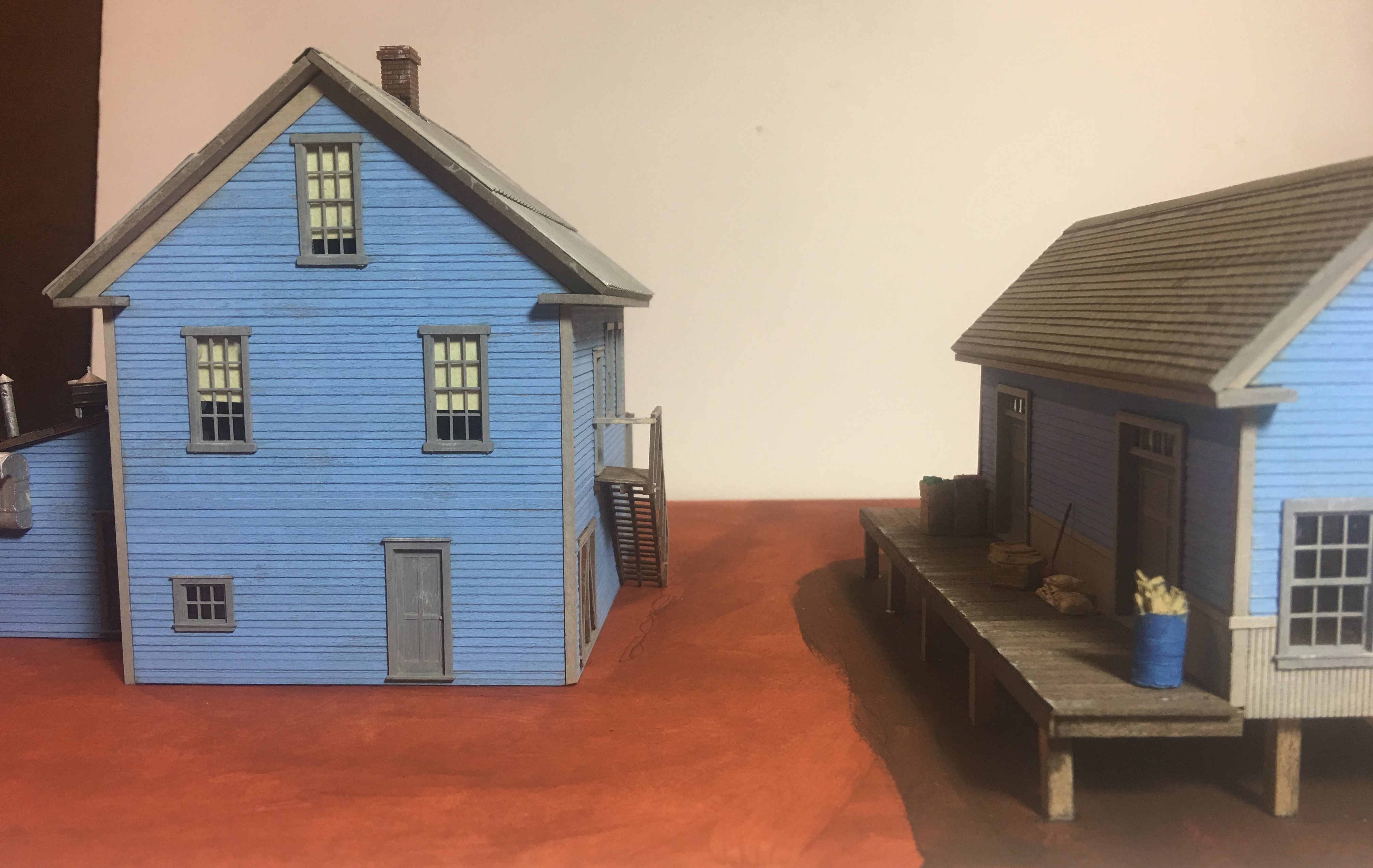 The basic kit will come with standing seam metal roofing for the store, tar paper for the restaurant and slate color 3-tab shingles for the depot.
